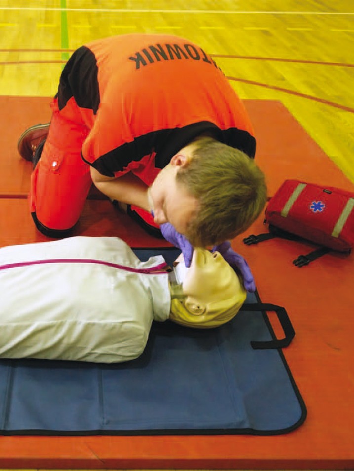 Resuscytację prowadzimy na twardym podłożu robiąc na zmianę: 30 ucisków klatki piersiowej i 2 oddechy ratownicze.